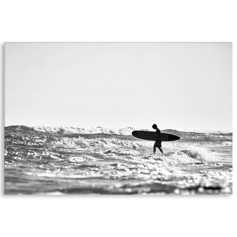Canvas Print: Surfers Beach I is a monochromatic seascape with a silhouette surfer walking into the ocean surf. The rolling waves of this coastal image evokes the feeling of calm and relaxation. Surfers Beach is reminiscent of summer holidays and is printed on high quality glossy poly-cotton canvas featuring high whiteness and superior colour brilliance and image definition with UV stabilised solvent ink. The canvas is stretched over a sturdy support frame with D-Rings and strung with cord ready to hang. Australian made under an Australian Made Campaign Ltd licence.