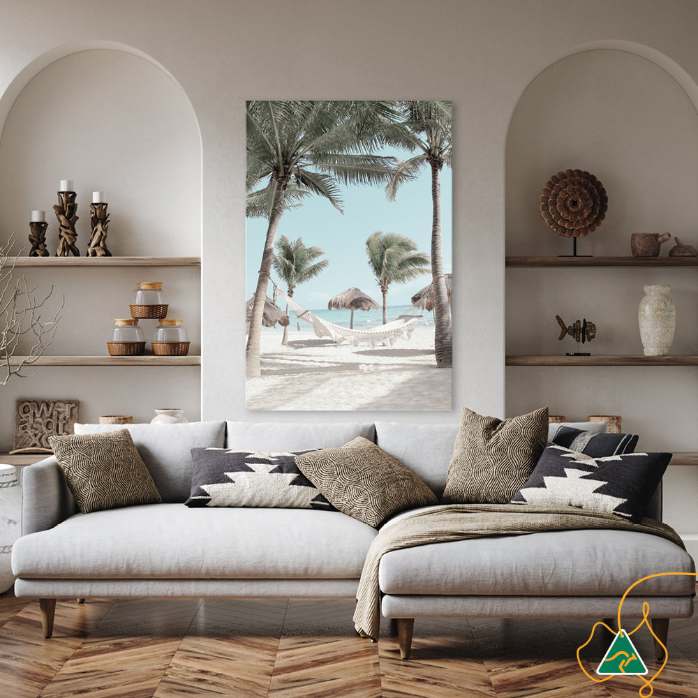 Canvas Print: Tropical Bounty I is a contemporary tropical coastal landscape. Bring joy and warm into your interiors with a hammock between tropical palms. The white sand and soft azure colour of tropical waters create a peaceful and tranquil ambience. Tropical Bounty I is the first in a series of three and is printed on high quality glossy poly-cotton canvas featuring high whiteness and superior colour brilliance and image definition with UV stabilised solvent ink. The canvas is stretched over a sturdy support frame with D-Rings and strung with cord ready to hang. Australian made under an Australian Made Campaign Ltd licence.