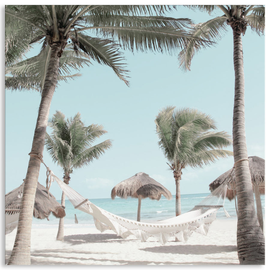 Canvas Print: Tropical Bounty IV is a contemporary tropical coastal landscape. Bring joy and warm into your interiors with a hammock between tropical palms. The white sand and soft azure colour of tropical waters create a peaceful and tranquil ambience. Tropical Bounty IV is the first in a series of three and is printed on high quality glossy poly-cotton canvas featuring high whiteness and superior colour brilliance and image definition with UV stabilised solvent ink. The canvas is stretched over a sturdy support frame with D-Rings and strung with cord ready to hang. Australian made under an Australian Made Campaign Ltd licence.