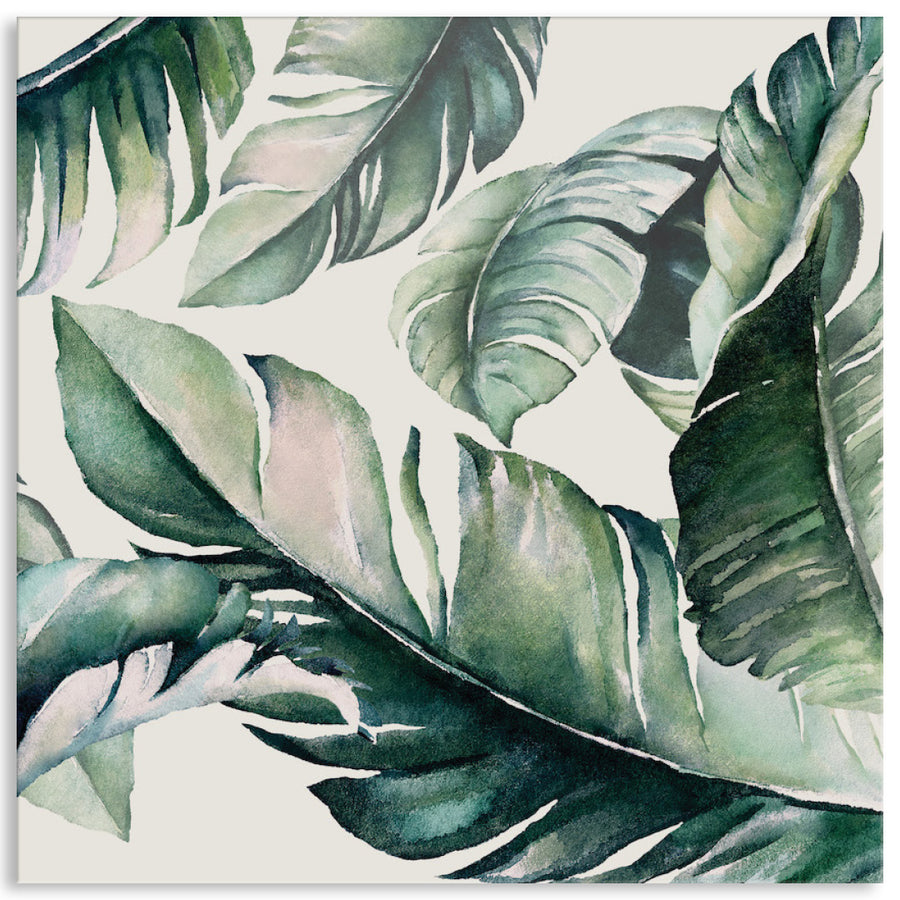 Canvas Print: Tropically Inspired II is a botanical watercolour in shades of green with a subtle blush hue. Inspired by banana leaves in lush landscapes of paradise. Tropically Inspired II evokes feelings of calm and happiness and memories of tropical vacations. Tropically Inspired II is printed on high quality glossy poly-cotton canvas featuring high whiteness and superior colour brilliance and image definition with UV stabilised solvent ink. The canvas is stretched over a sturdy support frame with D-Rings and strung with cord ready to hang. Australian made under an Australian Made Campaign Ltd licence.