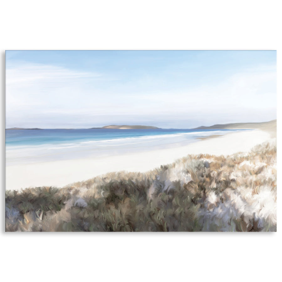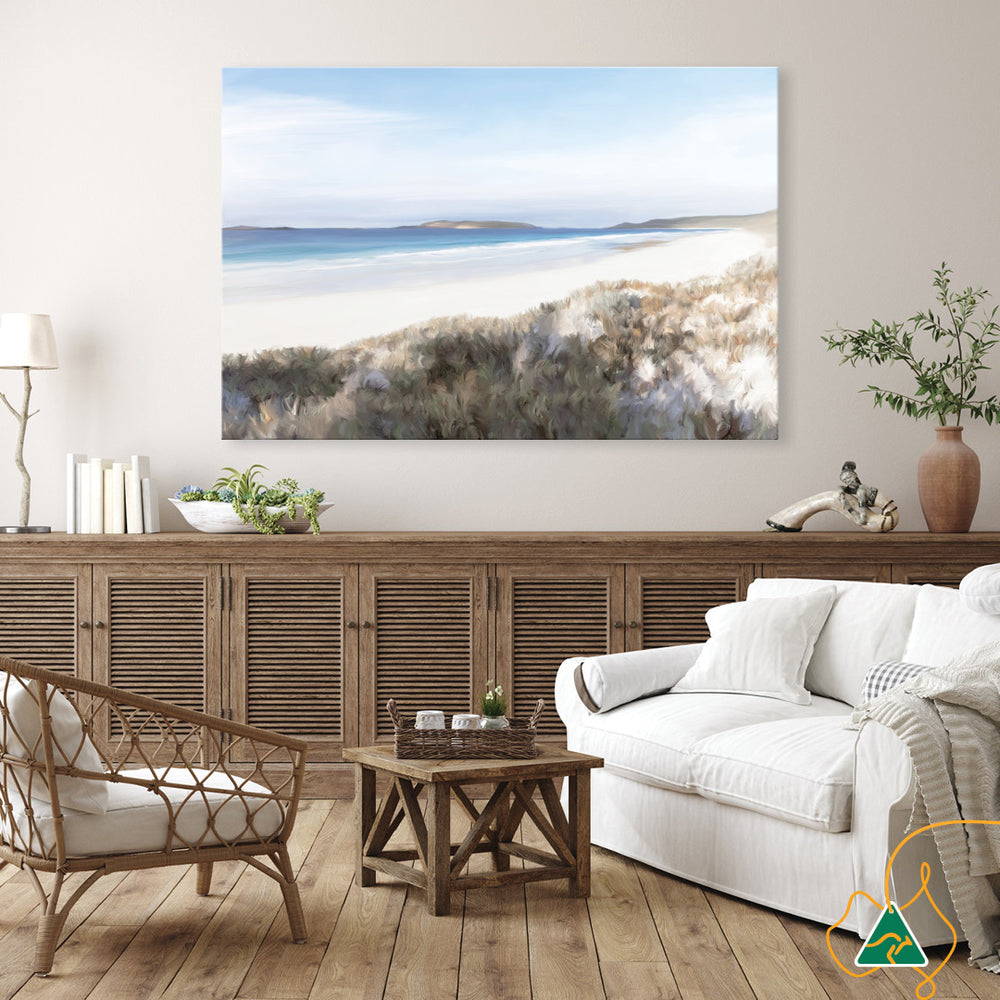 Canvas Print: Twilight Beach I is a painted coastal landscape inspired by the pristine beaches of Esperance, Western Australia. The amazing blue hues of the ocean, the white sandy beach and the green and golden tones of the beach grasses will elevate a neutral interior decor. Twilight Beach I evokes feelings of calm and happiness and memories of beach vacations. Twilight Beach I is printed on high quality glossy poly-cotton canvas featuring high whiteness and superior colour brilliance and image definition with UV stabilised solvent ink. The canvas is stretched over a sturdy support frame with D-Rings and strung with cord ready to hang. Australian made under an Australian Made Campaign Ltd licence.