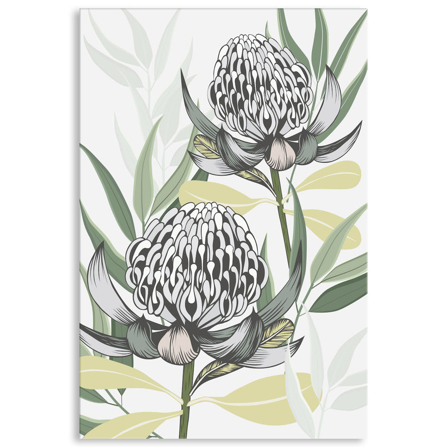 Canvas Print: White Waratah I is a modern Australian floral design in soft grey and green tones. Be inspired by the beauty and elegance of Australian flora. White Waratah I is a contemporary graphic that is happy and welcoming. White Waratah is printed on high quality glossy poly-cotton canvas featuring high whiteness and superior colour brilliance and image definition with UV stabilised solvent ink. The canvas is stretched over a sturdy support frame with D-Rings and strung with cord ready to hang. Australian made under an Australian Made Campaign Ltd licence.