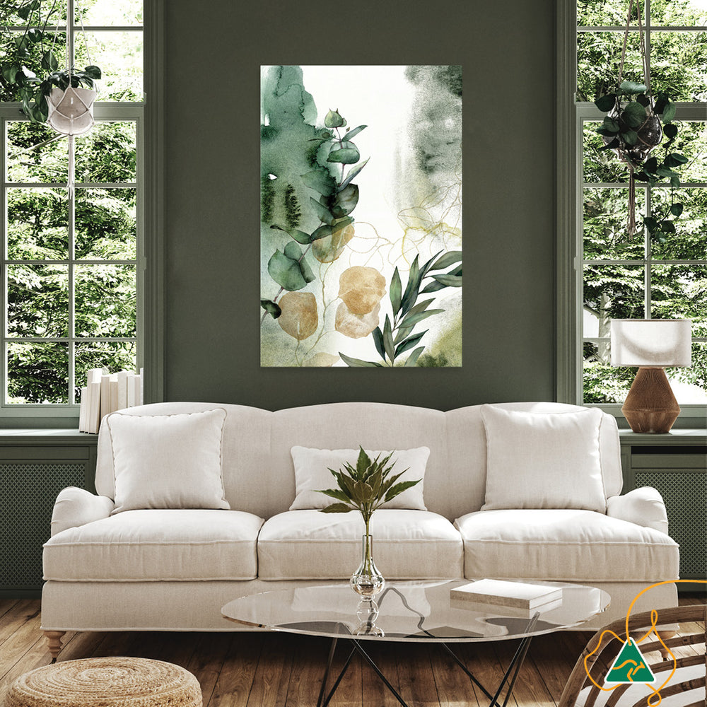 Canvas Print: Woodland Stroll II is an abstract botanical with a watercolour effect. Add colour and interest to your decor with the green and gold tones of eucalypt leaves. Woodland Stroll II will elevate your interior space making it feel fresh, warm and inviting. Woodland Stroll II is the second in a series of two and is printed on high quality glossy poly-cotton canvas featuring high whiteness and superior colour brilliance and image definition with UV stabilised solvent ink. The canvas is stretched over a sturdy support frame with D-Rings and strung with cord ready to hang. Australian made under an Australian Made Campaign Ltd licence.